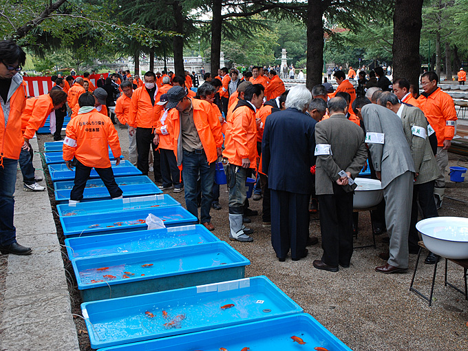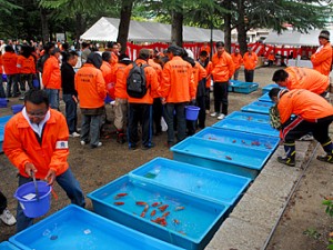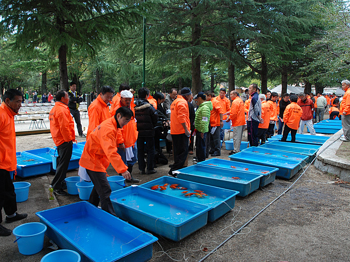 当歳魚の出品魚数は中部本部が担当の大会では、西部、東部からの出品も増えるため、収容池と点数の振り分け用の池が例年より倍増で、審査が進行していった。