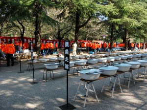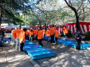 今回、中部本部が担当本部となり、魚係の方々など、一般の来場者との区別がすぐつくようにオレンジ色のウインドブレーカーが100着作られ、手際良く、受け付け、審査、魚の運搬が行われた。